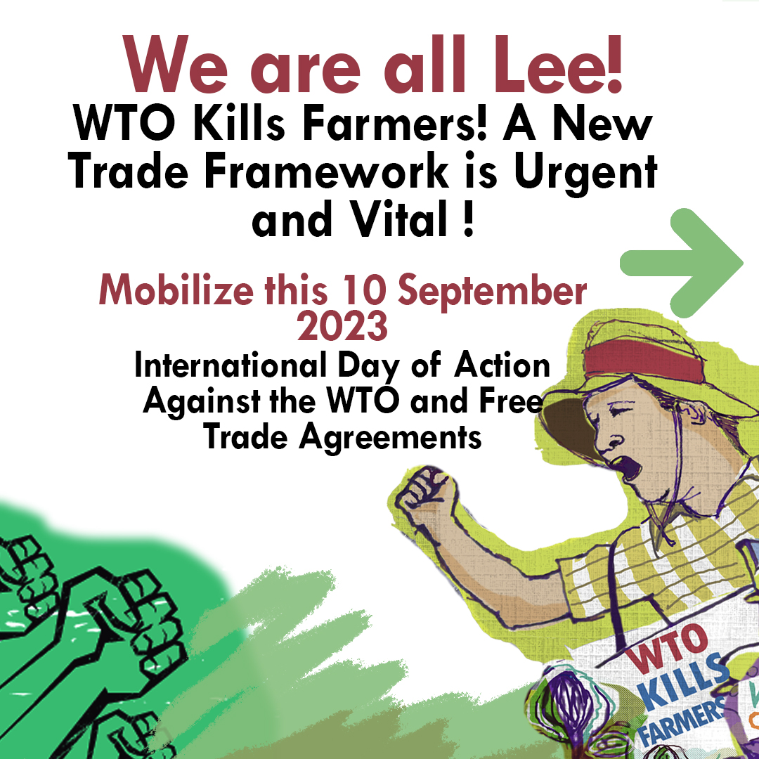 During the last Ministerial meeting in Geneva in 2022, La Via Campesina declared that the time had come to dismantle the WTO, discard the Agreement on Agriculture, put an end to harmful free trade agreements and establish a new trade framework for global agricultural trade based on principles of food sovereignty, solidarity, and internationalism. A new framework that respects and upholds the UN Declaration on the Rights of Peasants and Other People Working in Rural Areas (UNDROP)!