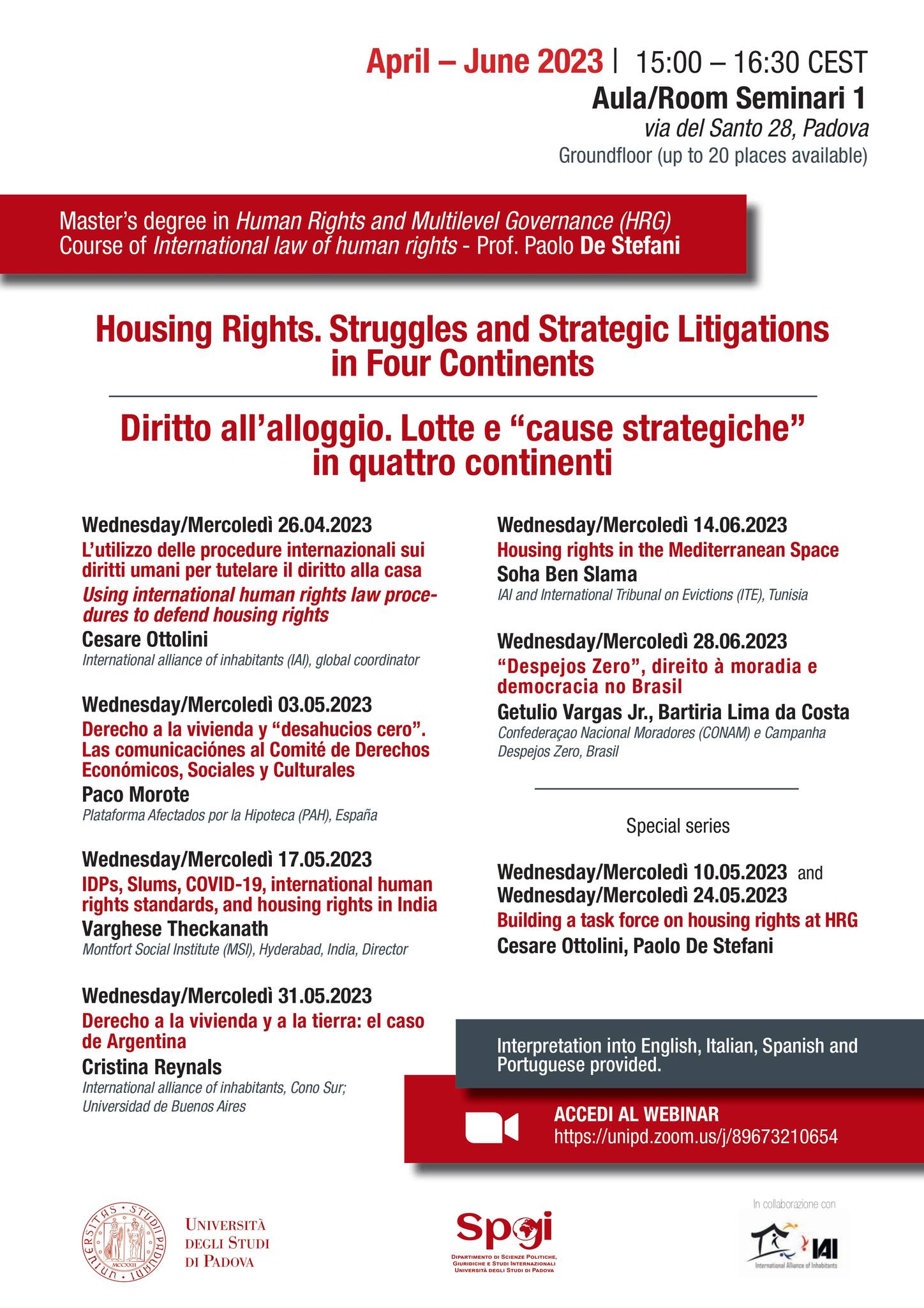 In the framework of the Master in Human Rights and Multi-Level Governance (HRG) of the Department of Political Science, Law and International Studies of the University of Padua (SPGI), the seminar series Housing Rights. Strategic Struggles and Disputes on Four Continents will take place from April 26 to June 28, 2023. The seminars, intended for students of the course of International Human Rights Law (Prof. Paolo De Stefani), are also open online to all those interested in the defense of the right to housing.