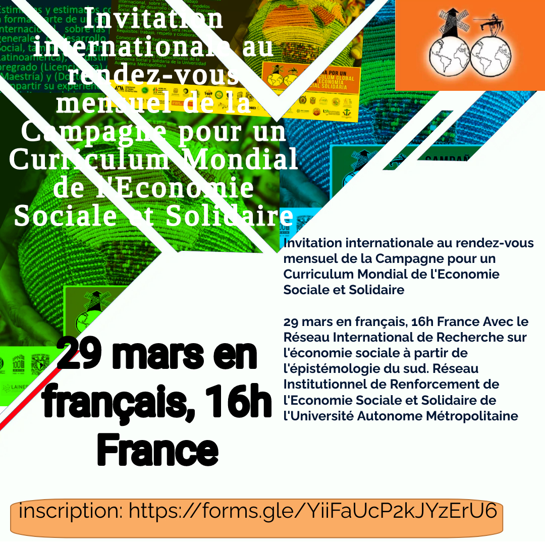 International invitation to the monthly meeting of the Campaign for a Global Curriculum of the Social and Solidarity Economy March 29 in French, 4:France pm With the International Research Network on the Social Economy from the epistemology of the South. Institutional Network for the Strengthening of the Social and Solidarity Economy of the Metropolitan Autonomous […]