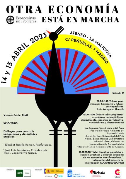 Durante esta IX edición de Otra Economía Está en Marcha reflexionaremos junto con Luis Aranguren sobre qué valores son necesarios para un cambio de paradigma real y conversaremos sobre cómo construir imaginarios y deseidades utópicas con Elisabet Roselló Román de Postfuturear y José Luis Fernández Casadevante, “Kois”, de la cooperativa Garúa. Abordaremos un conjunto de propuestas teóricas sobre las que ya se están avanzando para poder progresar en el diseño de estos horizontes utópicos (decrecimiento, economía participativa, ecosocialismo y cibercomunismo) y para ello contaremos con Eva Sampere, Coordinadora del Área Federal de Medio Ambiente de Izquierda Unida; Jon de las Eras, Universidad del País Vasco/Euskal Herriko Unibertsitatea; Martín Lallana, militante del Área de Ecosocialismo de Anticapitalistas e investigador de la Universidad de Zaragoza; y Rodolfo Monico, perteneciente al colectivo Cibcom. Las jornadas finalizarán con el taller Nuestras paradojas a examen: prácticas y desafíos cotidianos de las economías transformadoras, llevado a cabo por una parte del grupo del proyecto de investigación ECOEMBEDEDDNESS.
