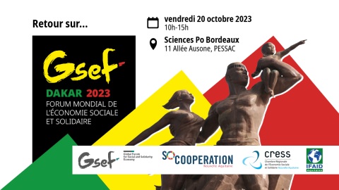 Le GSEF, SoCoopération, l’IFAID Aquitaine et la CRESS Nouvelle-Aquitaine vous invitent à Bordeaux le 20 octobre pour la restitution du Forum Mondial de l’Economie Sociale et Solidaire #DakarGSEF2023 ! Cet événement sera l’occasion de revenir sur le Forum de Dakar : le bilan, les avancées et vos retours d’expérience. Nous ferons ensemble le point sur les apprentissages à tirer de l’édition 2023 en vue des prochaines, notamment #BordeauxGSEF2025. Découvrez en avant-première le Film du Forum ainsi que les Actes du Forum, et venez échanger avec les acteurs et actrices de l’ESS et de la solidarité internationale !