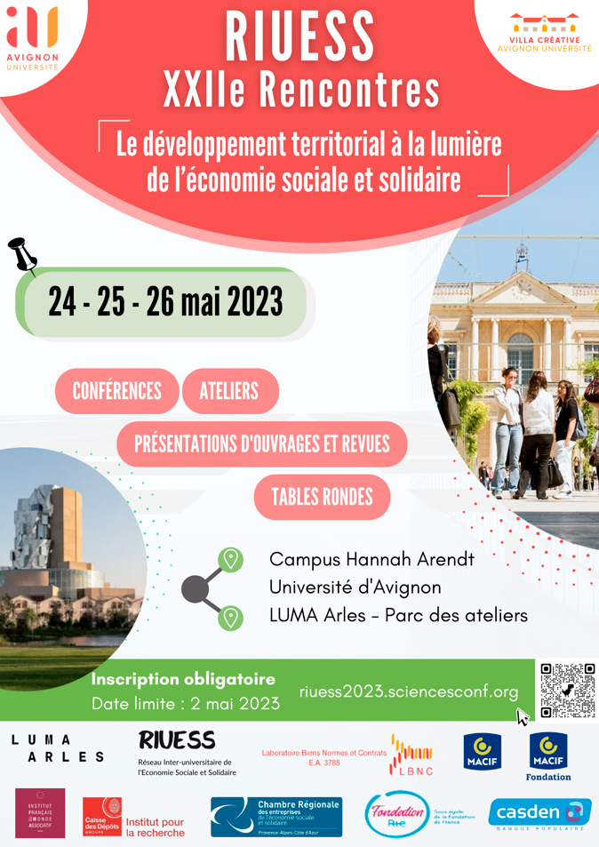 Les XXIIe Rencontres du RIUESS se dérouleront à l’Université d’Avignon et porteront sur le développement territorial à la lumière de l’ESS. Elles exploreront les ressorts et les logiques de développement territorial au regard de l’économie sociale et solidaire (ESS). Il s’agit de proposer un état approfondi des recherches en ESS ou se situant dans le champ de l’ESS, sous différents angles problématiques disciplinaires ou transversaux.