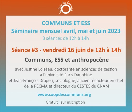 La troisième séance du séminaire Communs et ESS de La Coop des Communs aura lieu le vendredi 16 juin de 12h à 14h en format hybride autour du thème : « Communs, ESS et anthropocène », avec Justine Loizeau, doctorante en sciences de gestion à l’université Paris Dauphine et Jean-François Draperi, sociologue, ancien rédacteur en chef de la RECMA et directeur du CESTES du CNAM.
